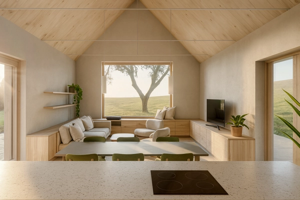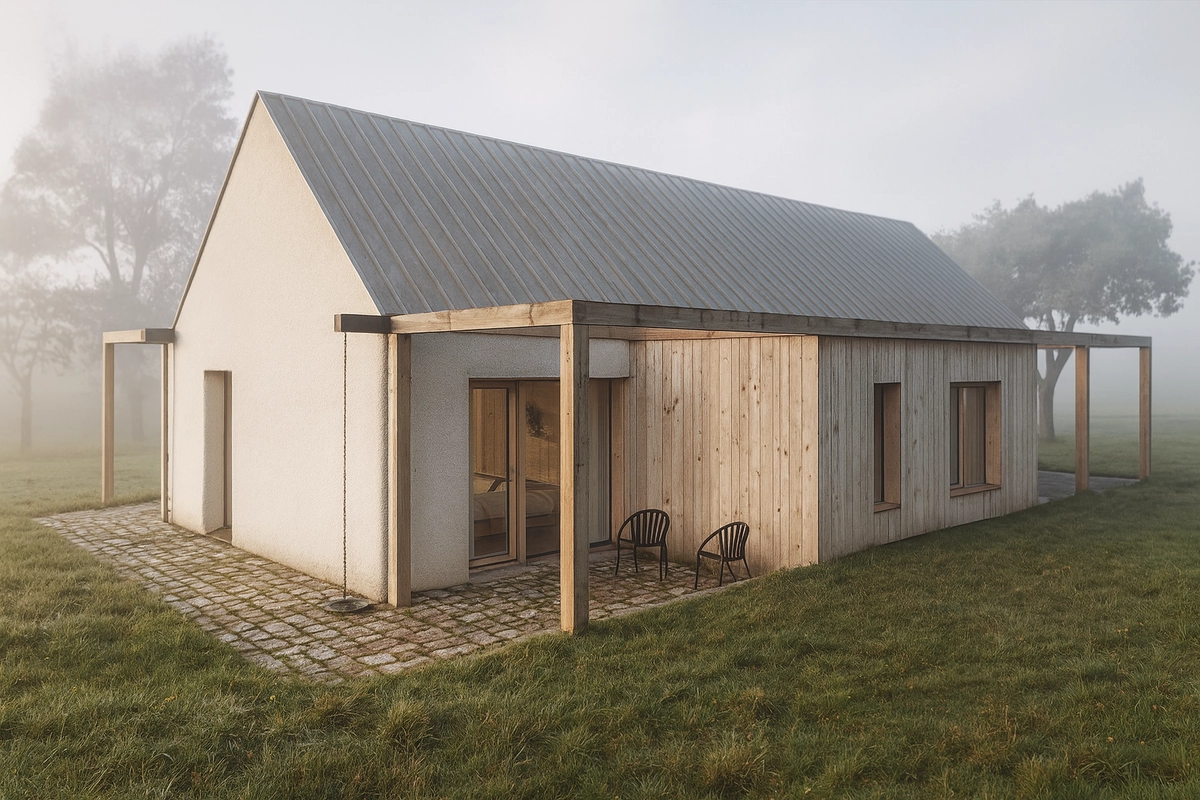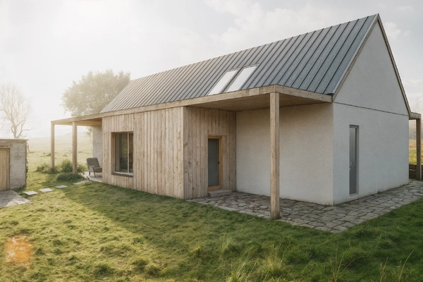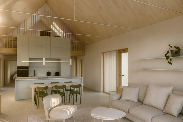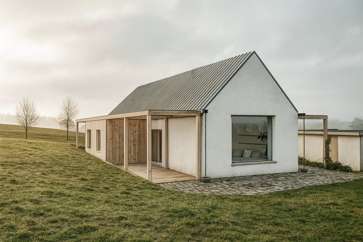 Ve Fryštáku, na klidném místě, vzniká jednopodlažní rodinný dům se sedlovou střechou, který působí, jako by tam stál od nepaměti a respektuje okolní zástavbu. Dva jednoduché přístavky k němu přirozeně přiléhají a tvoří tiché zázemí pro každodenní život. Dispozice je promyšlená tak, aby všechno bylo na dosah ruky. Dům je jednoduchý, účelný a přitom útulný. Světlá fasáda s dřevěnými prvky se krásně pojí s venkovským prostředím.