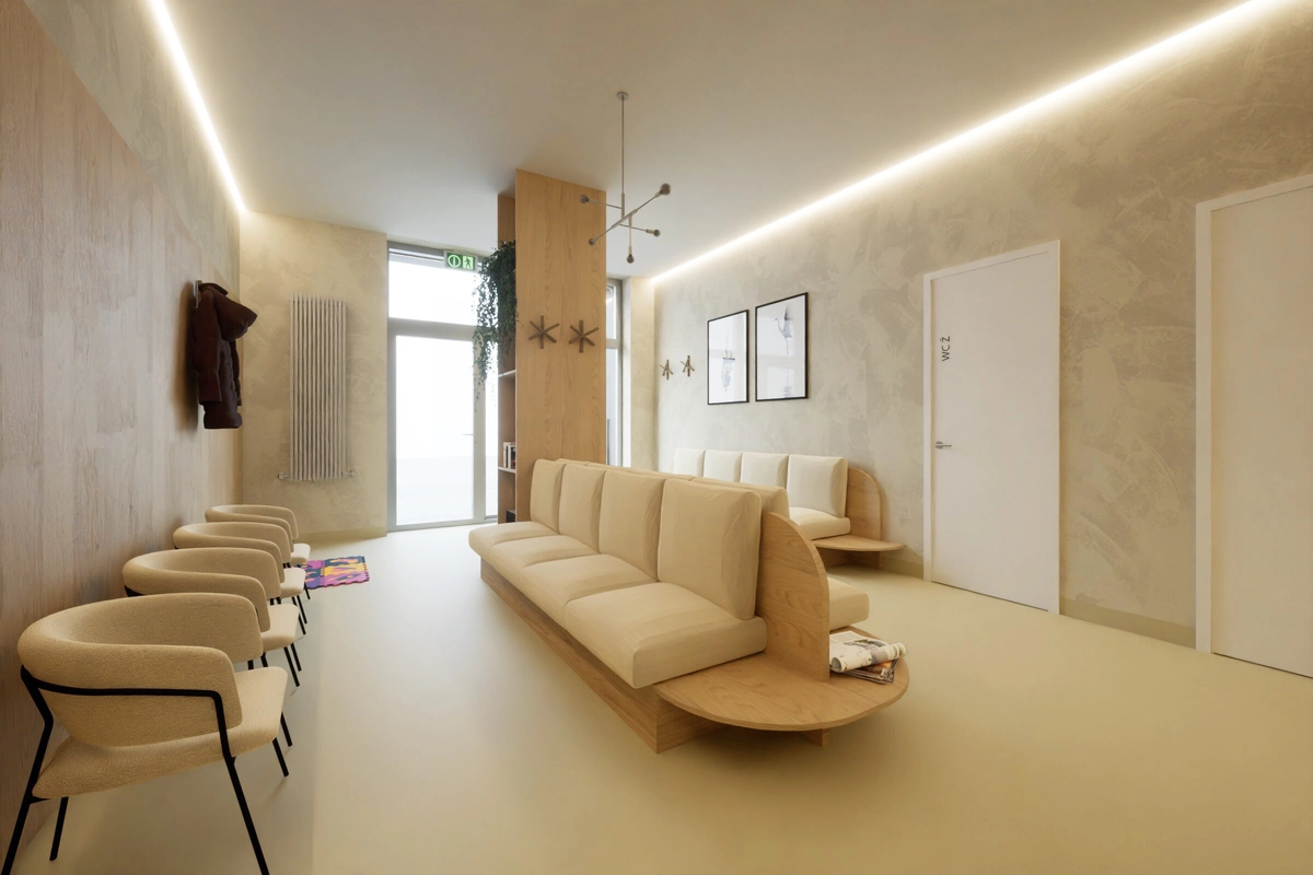 Klient nás oslovil s výzvou přestavby stávajících komerčních prostor na moderní stomatologickou kliniku, která měla zahrnovat šest ordinací a odpovídající zázemí jak pro zaměstnance, tak pro pacienty. Při návrhu jsme byli limitováni rozměry stávající budovy a specifickými požadavky kladenými na zdravotnická zařízení – hygienickými normami i přísnými požárními předpisy. Najít optimální řešení bylo skutečnou výzvou – a právě to jsou výzvy, které nás baví.